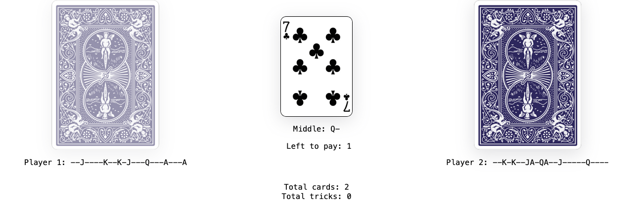 Now the second player has to place down two of their cards in order to pay for it. Since neither of these are face cards, they finish paying and the first player wins that trick and these cards get added to the first player’s hand.
