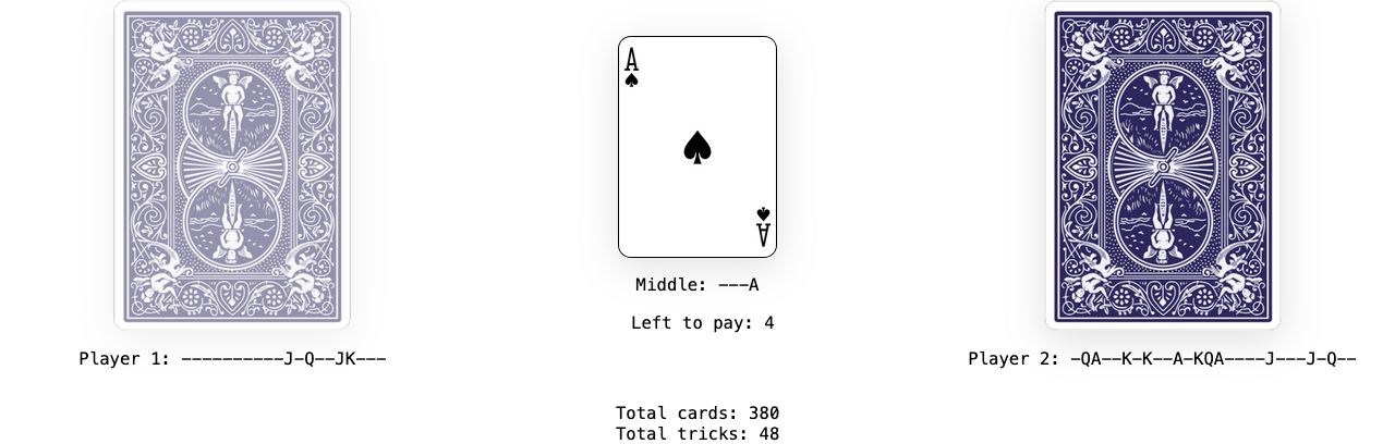 I’m showing the contents of each players’ hands here but in a real game, these would be kept hidden. Since the values of the non-face cards don’t matter, here they’re just denoted with a -, and the suit information is irrelevant to the game so each face card is just ace (A), king (K), queen (Q) or jack (J).