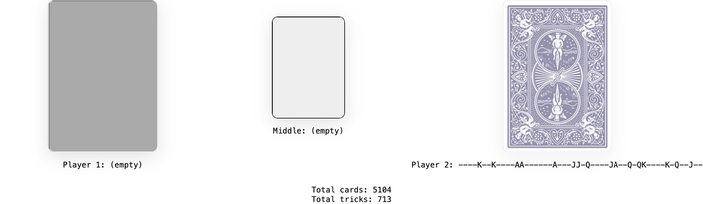But alas, this turned out to not be the case. Over several years, many people found starting hands which went on for longer and longer, but none that formed cycle. Clearly a different approach was needed. Indeed, before this non-terminating game was constructed, on the order of $10^{13}$ games had been checked; eating up significant compute.