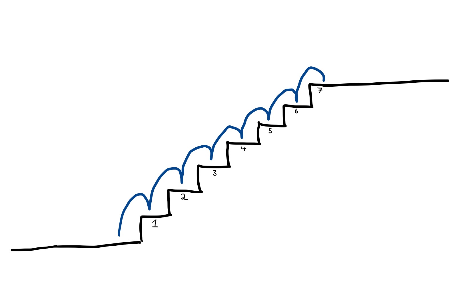Assuming that you can’t jump over more than 2 steps at a time, how many different ways are there of running up the stairs to get to your office? For example, you could carefully tread on each step one-by-one: