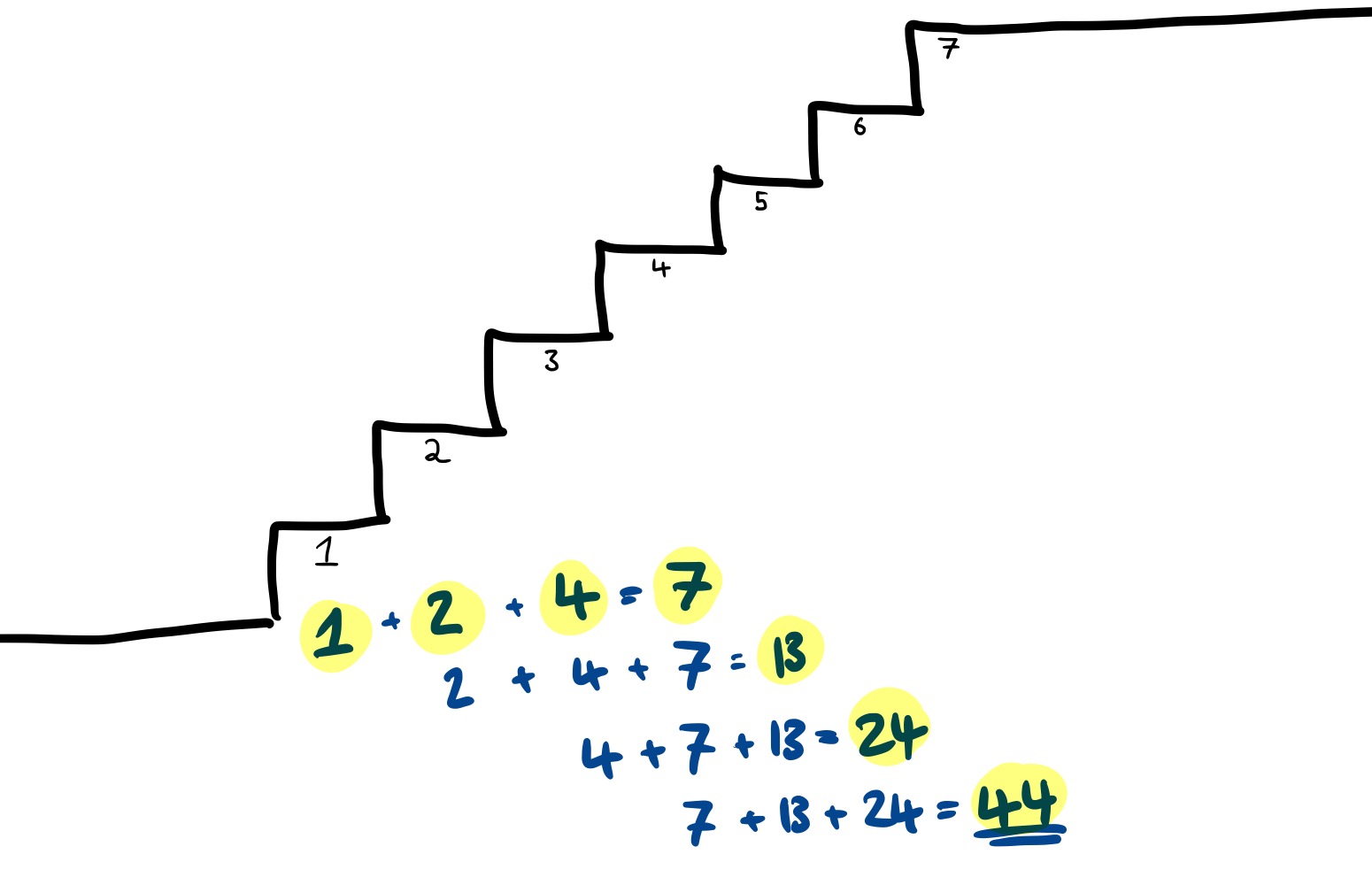 And finally, how many ways are there of reaching the seventh step, which is also the landing? It can be reached from steps four, five and six, which themselves can be reached in 7, 13 or 24 ways. Since $7 + 13 + 24 = 44$, there are 44 ways of reaching the seventh step, and therefore 44 ways of running up one flight.