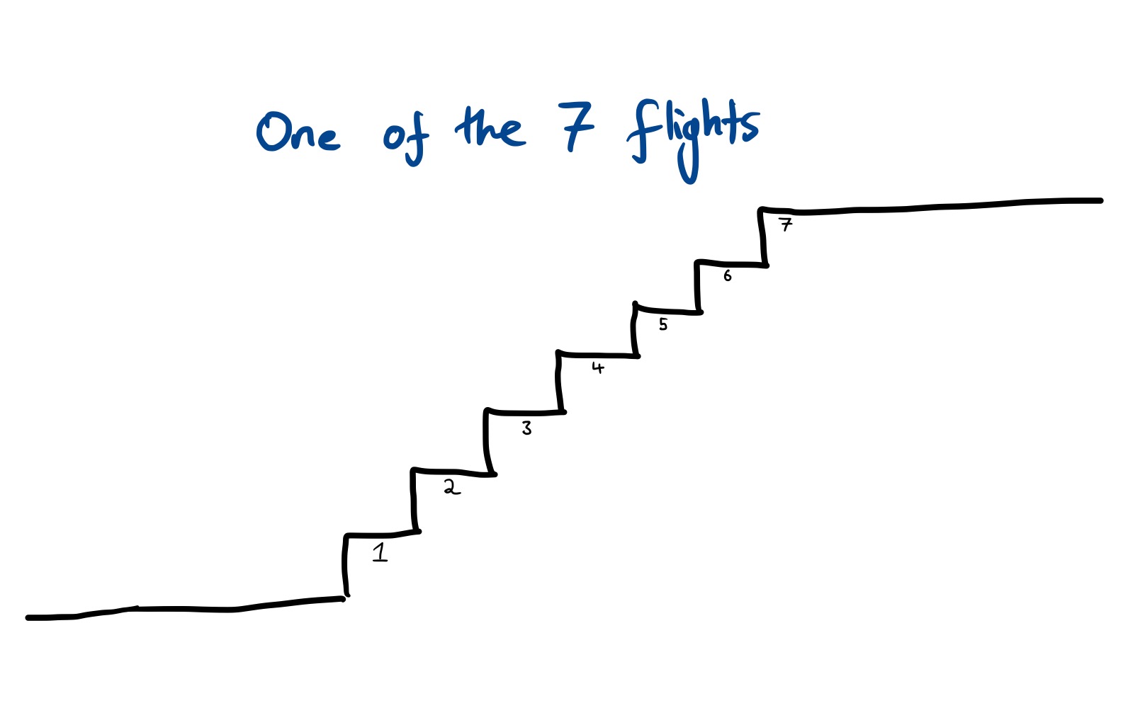 There are 7 flights of stairs in total, each of which having 7 steps (starting from the first step raised from the ground, and counting the landing as a final step).