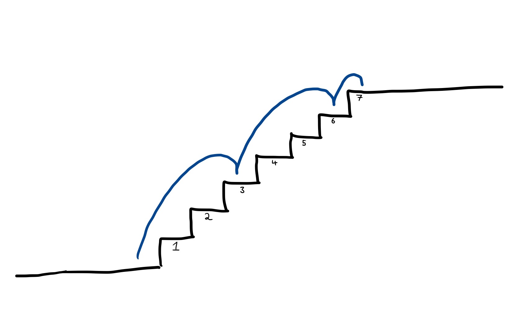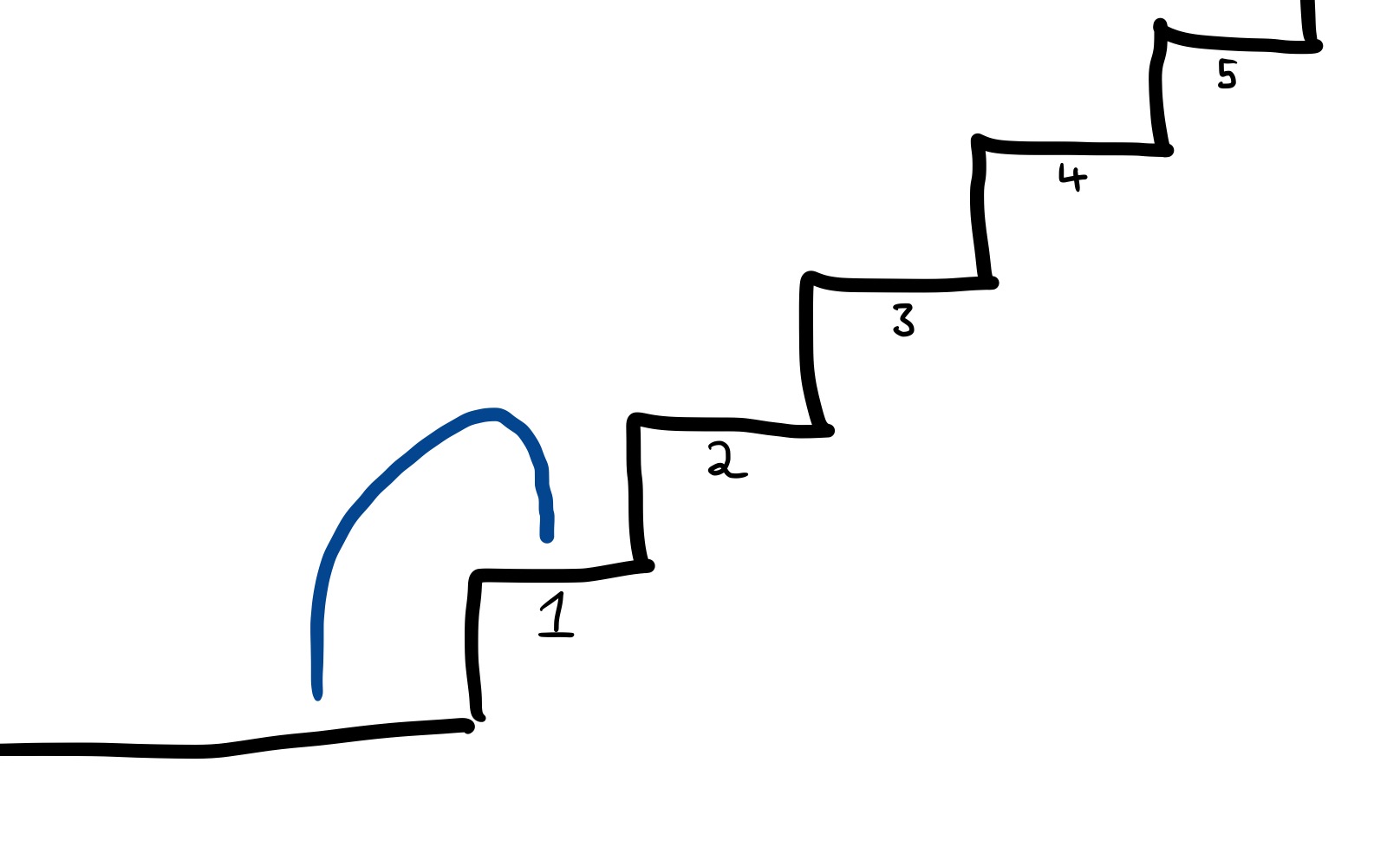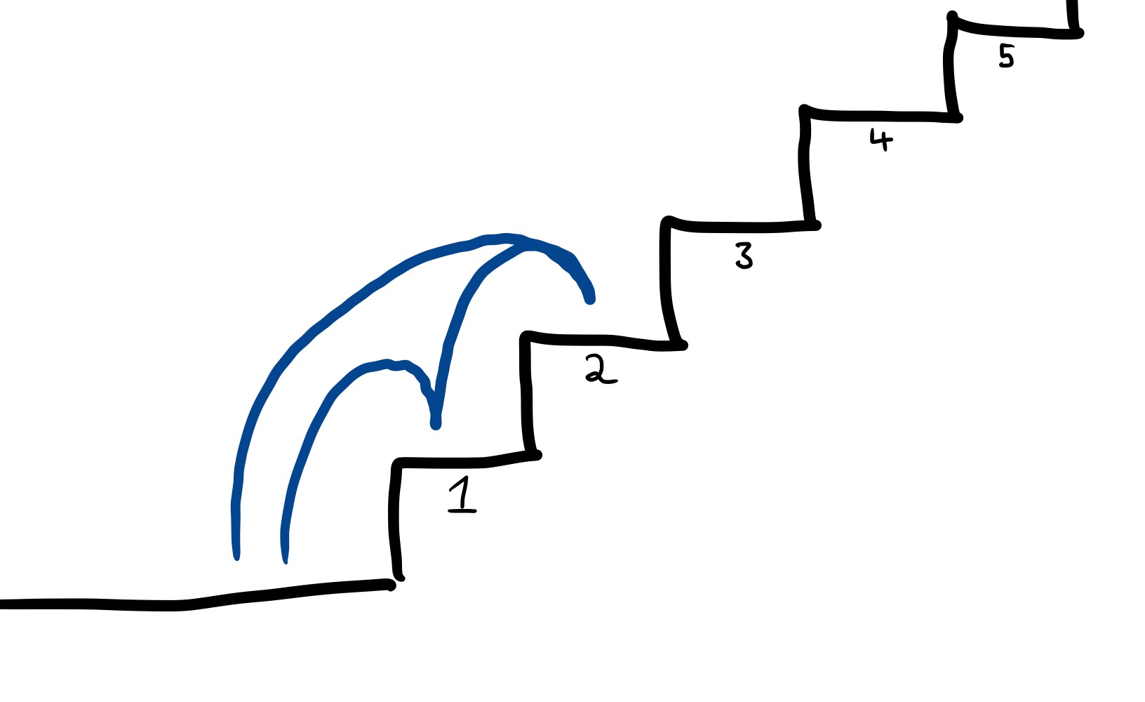 Assuming that you can’t jump over more than 2 steps at a time, how many different ways are there of running up the stairs to get to your office? For example, you could carefully tread on each step one-by-one:
