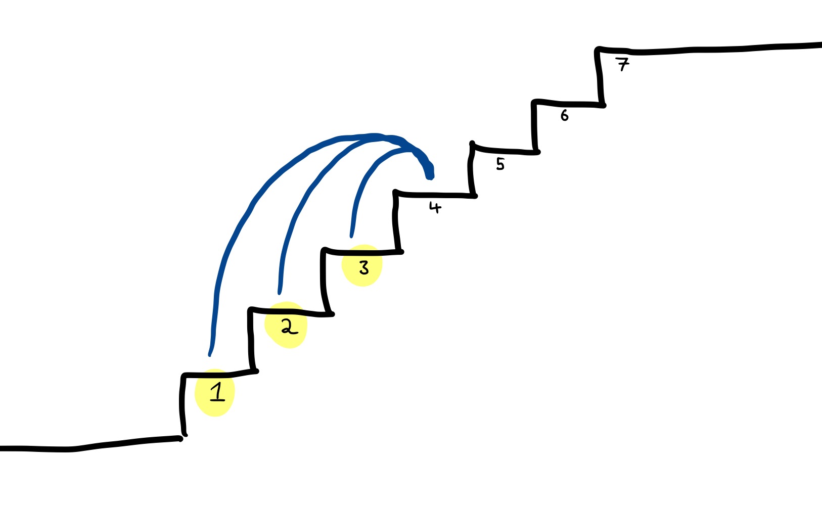Now things get more complicated, since it’s not possible to go directly to the fourth step from the ground: this would involve skipping over three steps, which is not allowed. But now things are actually easier! Which steps are one leap away from the fourth? Steps one, two and three.