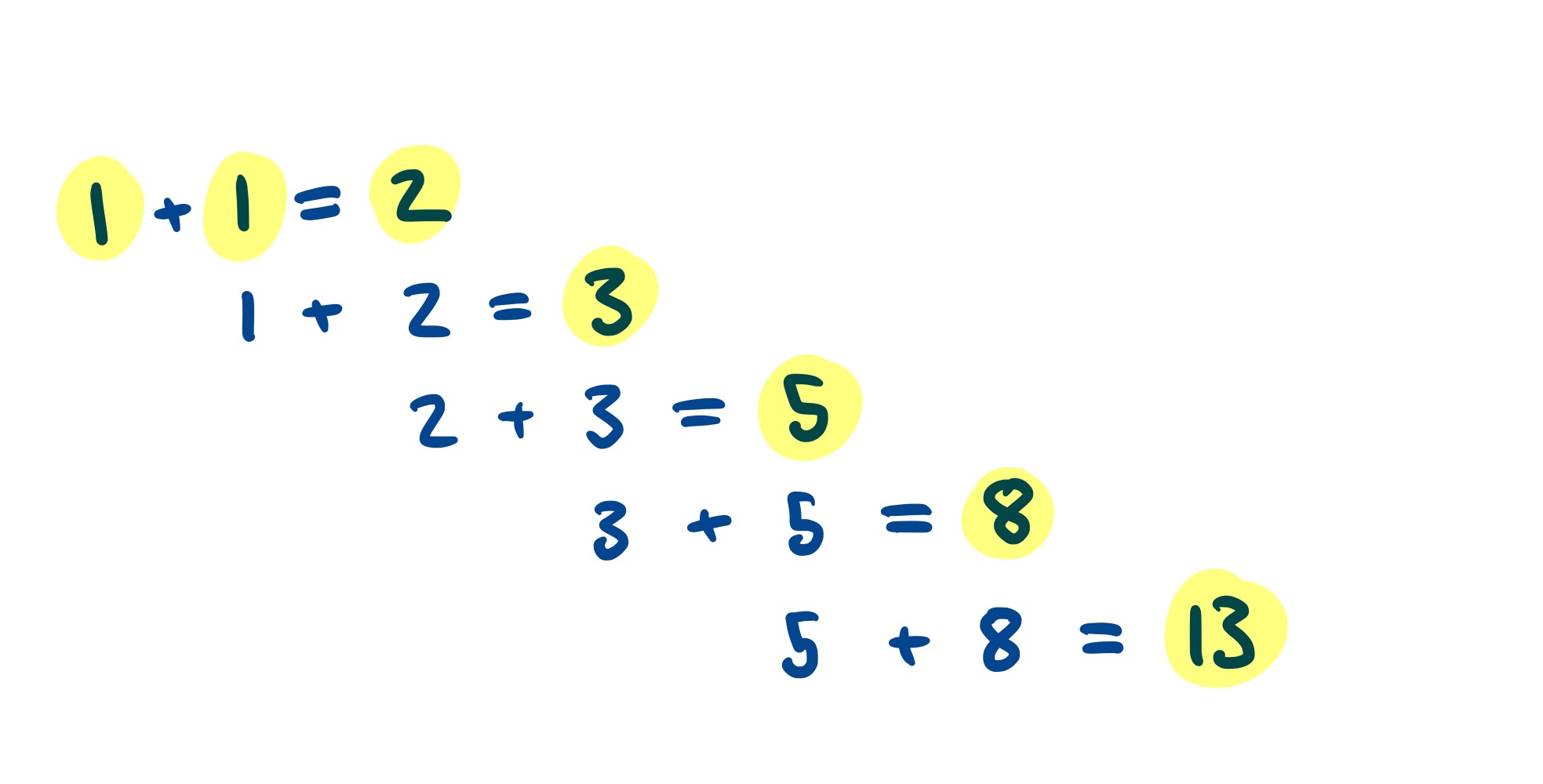 This should be reminiscent of the Fibonacci sequence. That’s produced exactly the same way, except you start with the two ones and then add up the previous pair to produce the sequence: