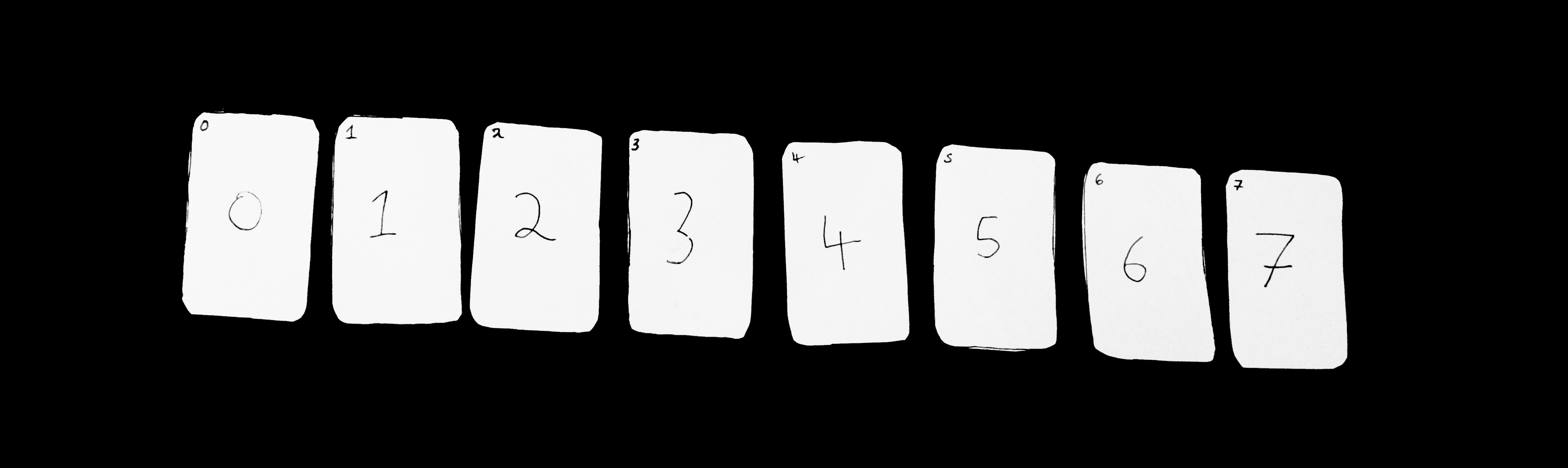 Let’s see if we can formalise what is going on in a perfect riffle shuffle. To simplify, rather than a full deck of 52 cards, it will help to consider just 8 cards. We’ll also forget about suits, and instead label all the cards from 0 to 7: