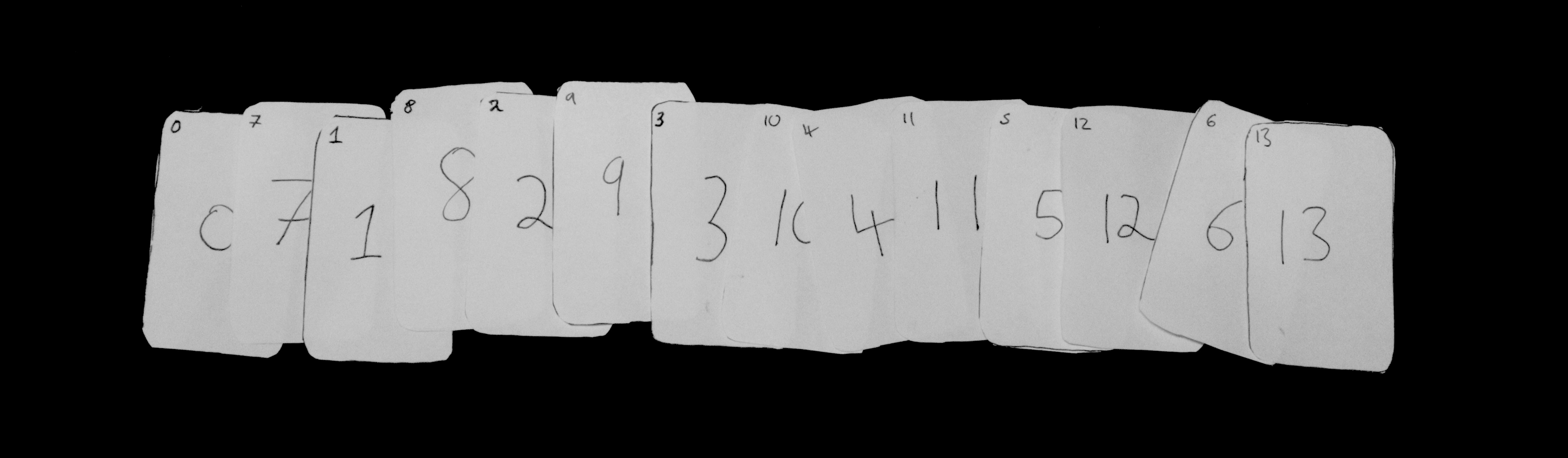 3 shuffles: | 0| 8| 3|11| 6| 1| 9| * | 4|12| 7| 2|10| 5|13|