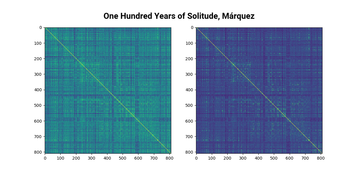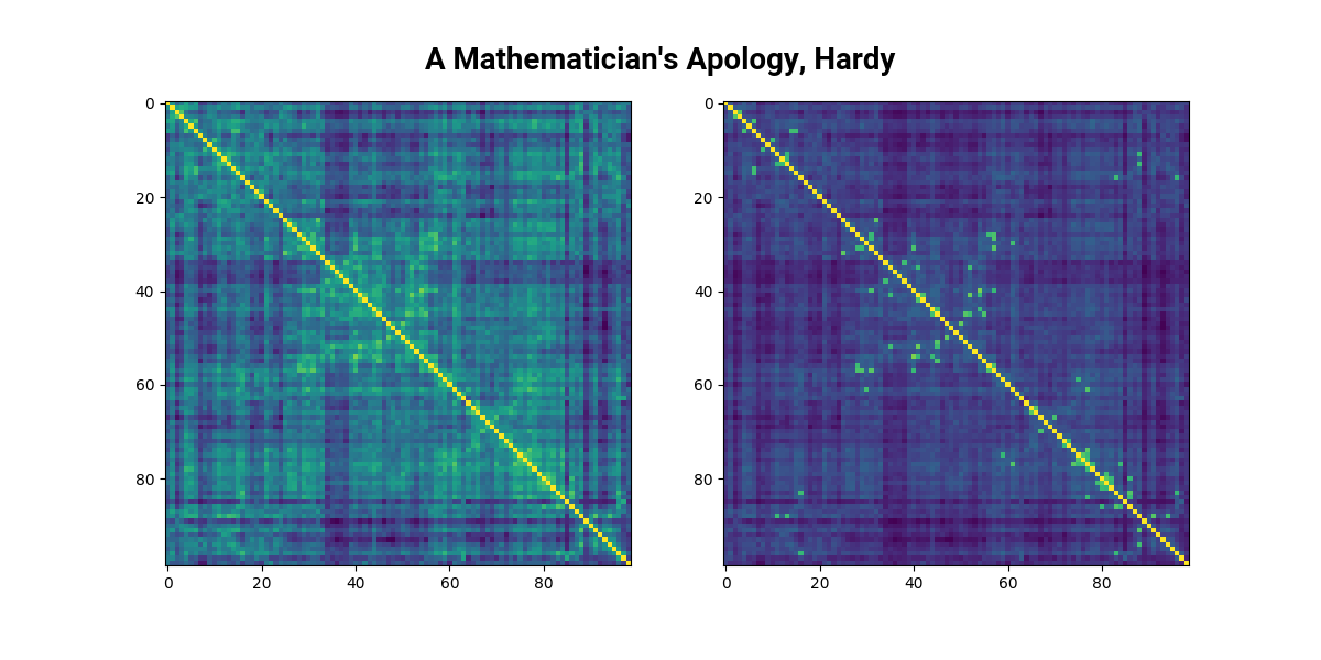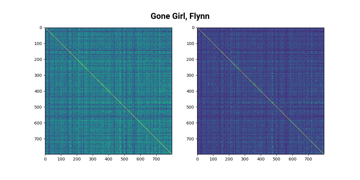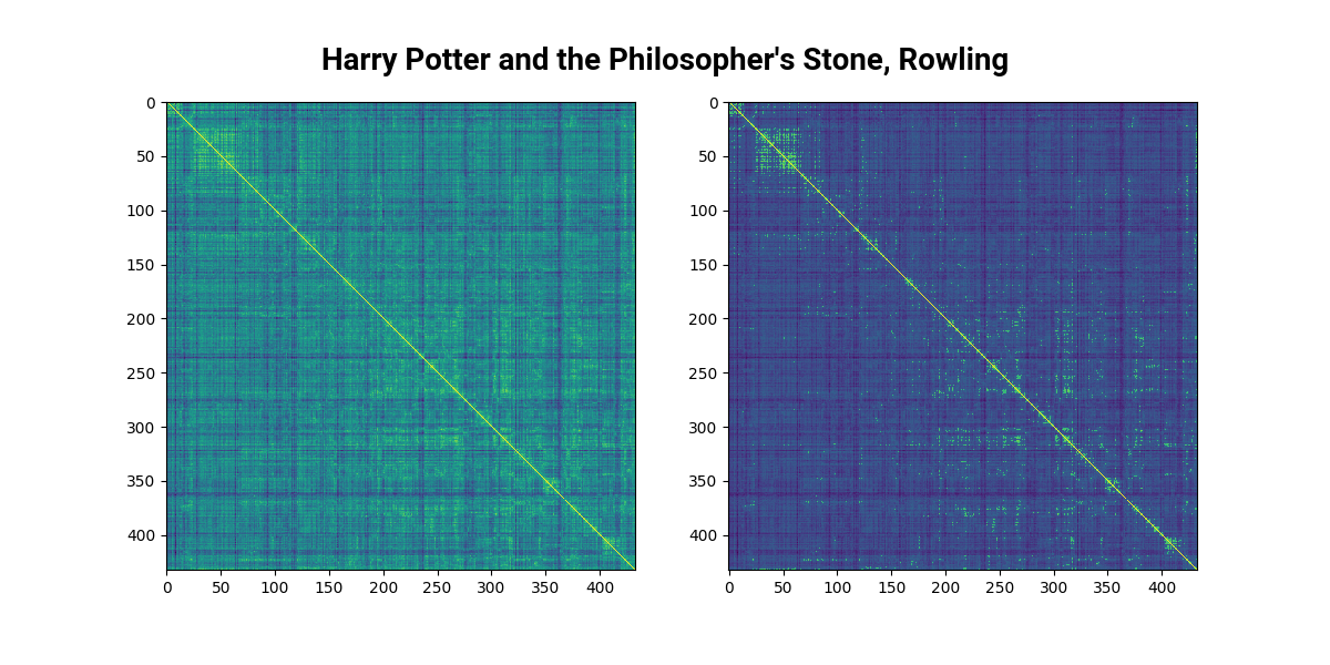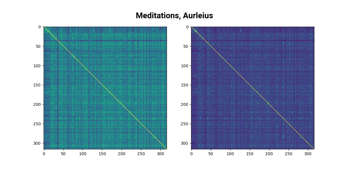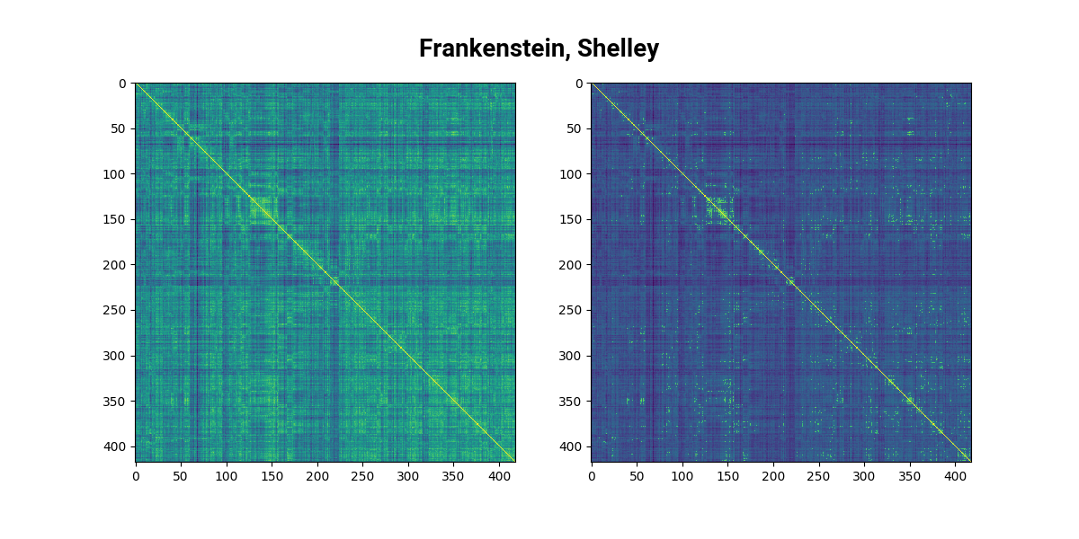 The left hand side of each diagram is the raw semantic similarity between passages, as computed by the all-MiniLM-L6-v2 model. The right hand side highlights the entries which are more than two standard deviations away from the mean, and are anomalously similar compared to the rest of the book.