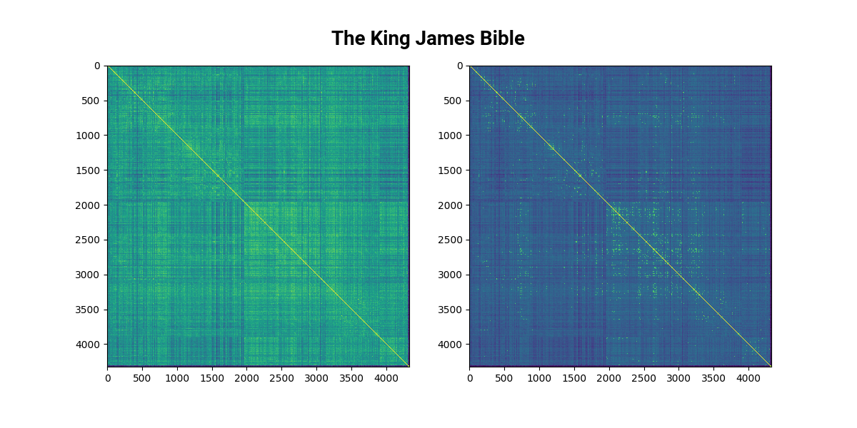 - Splotches of brightness off the diagonal are places where to different parts of the text are similar.