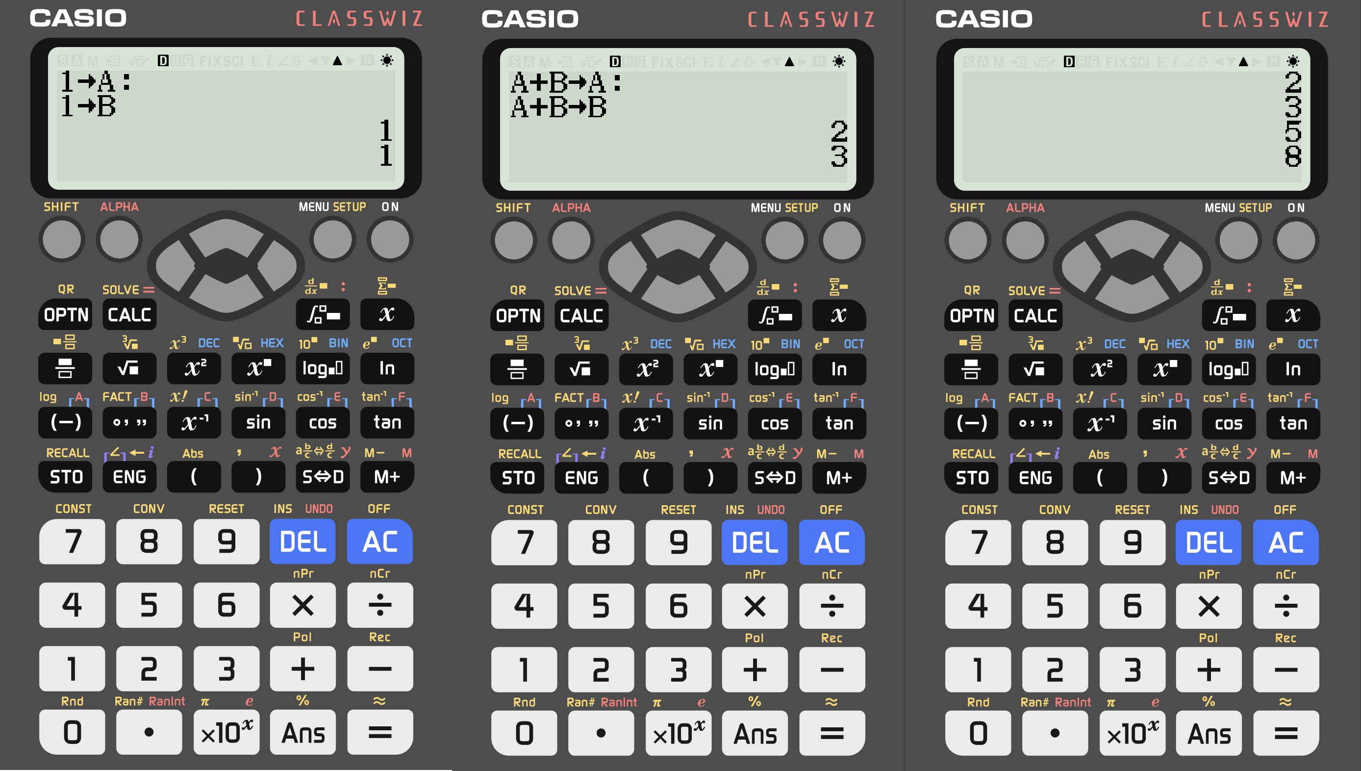 This language matches closely matches the kinds of expressions that the Casio FX-991EX scientific calculator accepts, which is described as “non-programmable”. Since CALC is Turing-complete, this means that (up to memory limitations) the calculator can actually do arbitrary computation. The key differences between CALC and the calculator are: