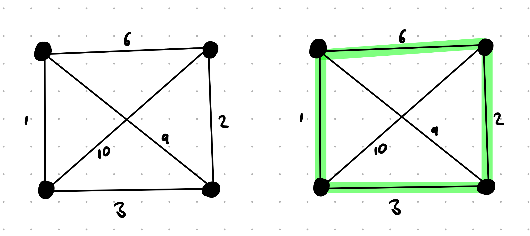 \[\sum^{k} _ {i = 1} w(v _ {i-1},v _ i)\]TSP (formally): Let $G = (V, E, w)$ be a weighted graph where: