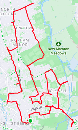 Of course, this is not unique: it doesn’t matter if you start and end at any other college or run around in reverse since it will still be the same distance. This solution is optimal according to the software I used, assuming that it knows the accurate walking distances between each college. It’s possible that there’s shortcuts that it doesn’t know about (e.g. in the above it’s actually possible to go diagonally across the park next to “New Marston Meadows”) and this could change the solution.