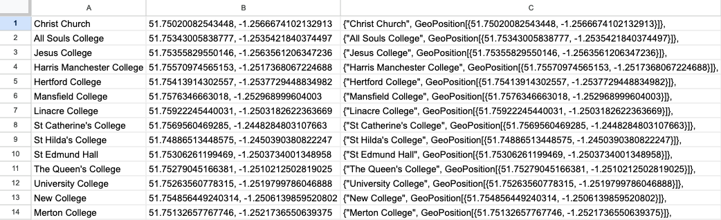 I used the following coordinates for the colleges. I tried to pick the front of the colleges since the location you get from just typing the name into Google Maps would sometimes be at a random spot inside the college, which might mess up the walking distance calculation made by Wolfram.